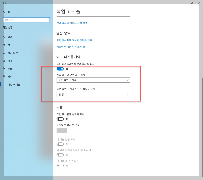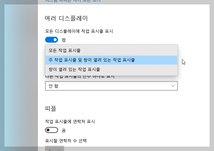 12. 독립적으로 작업표시줄을 사용하려면 모든 작업표시줄을 주 작업표시줄 및 창이 열려 있는 작업표시줄로 변경해주세요.