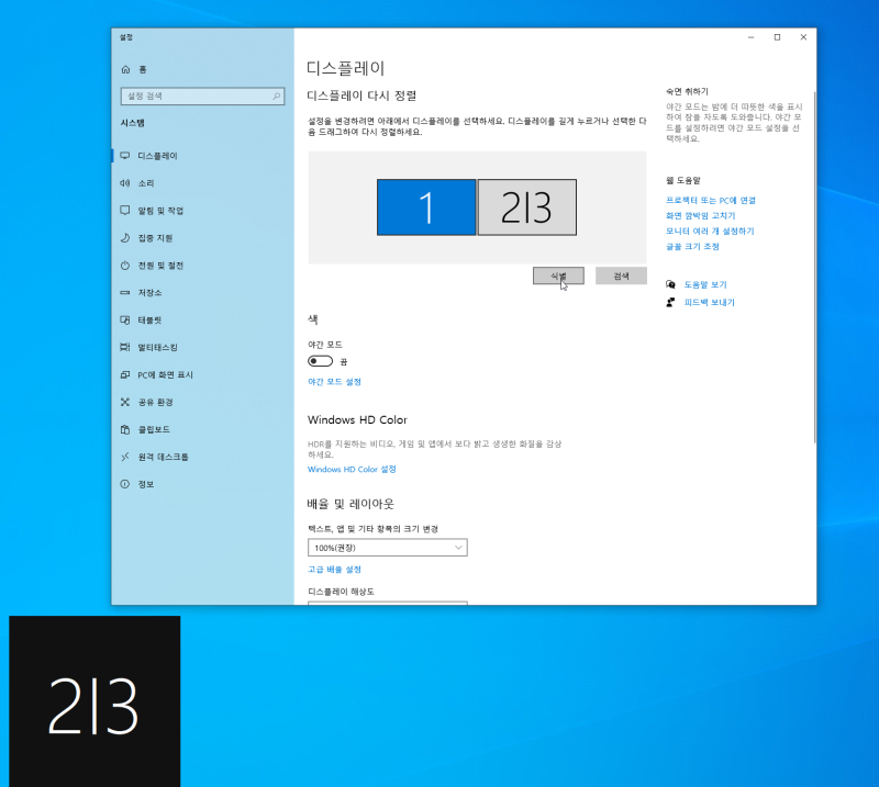 3. 식별 1번 모니터를 누르고 하단에 배율 및 레이아웃을 보면 디스플레이 해상도, 크기 설정이 되어있는게 보이실겁니다.