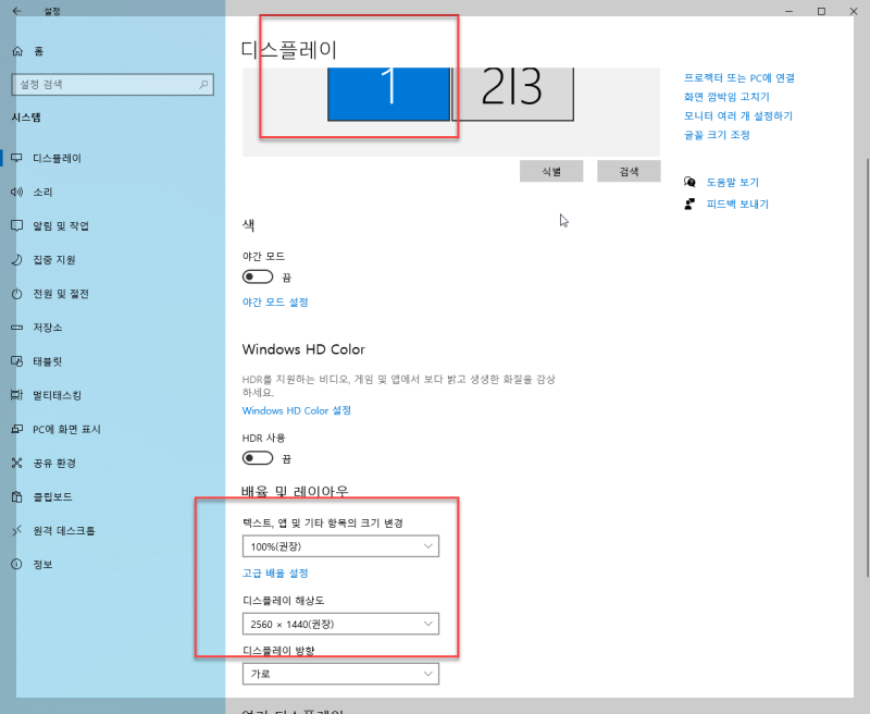 3. 식별 1번 모니터를 누르고 하단에 배율 및 레이아웃을 보면 디스플레이 해상도, 크기 설정이 되어있는게 보이실겁니다.