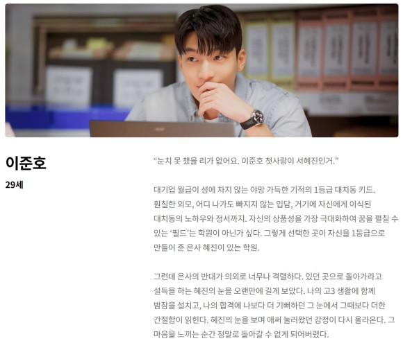 선생님 혜진을 첫사랑으로 짝사랑해온 대치동 키드 이준호.