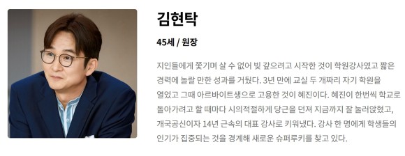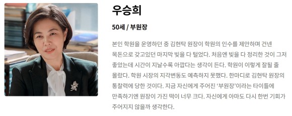 사교육 학원 시장의 지각변동을 예측하지 못하고 김현탁에게 학원을 팔고 부원장 자리로 가면서 만족하지 못해 재기를 노리는 인물. 김정연 배우가 연기하는데요. <풍문으로 들었소>,<더 글로리 파트 1,2>로 유명한 배우죠!