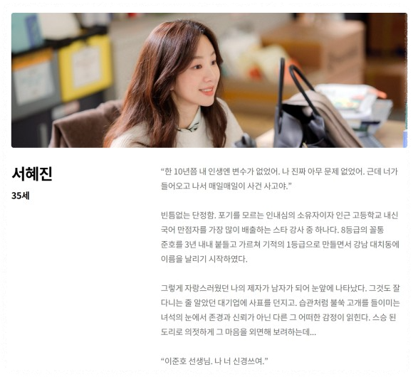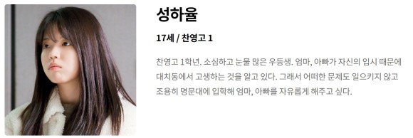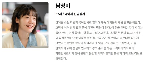 소형 학원 국어강사로 일하며 대치동 채용 공고를 통해 혜진의 팀원이 된다고 하는데요. 준호의 친구 최승규와의 러브라인. 남청미 역을 연기하는 소주연 배우는 <회사 가기 싫어>,<낭만닥터 김사부 2,3>에 연달아 출연했었습니다.