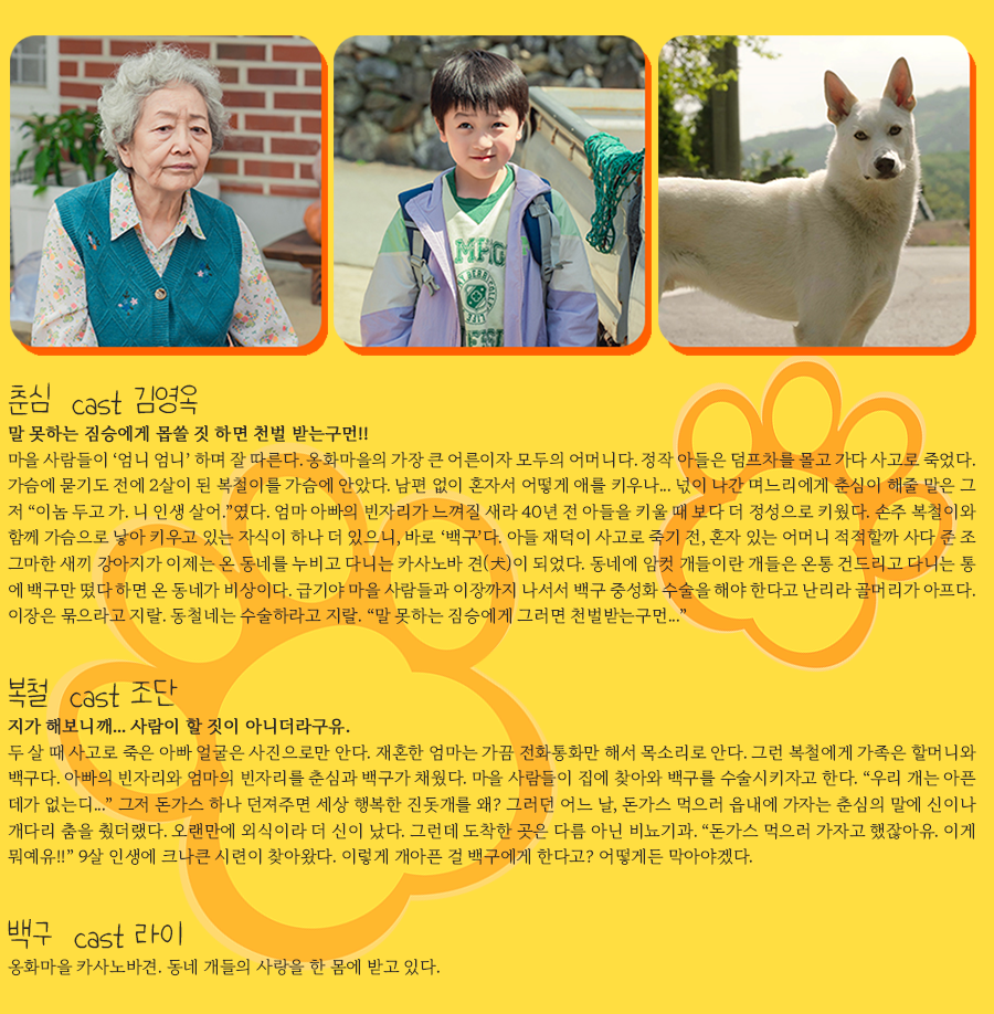 라이 라는 개가 캐스팅 되었는데 백구라는 등장인물로 나옵니다.